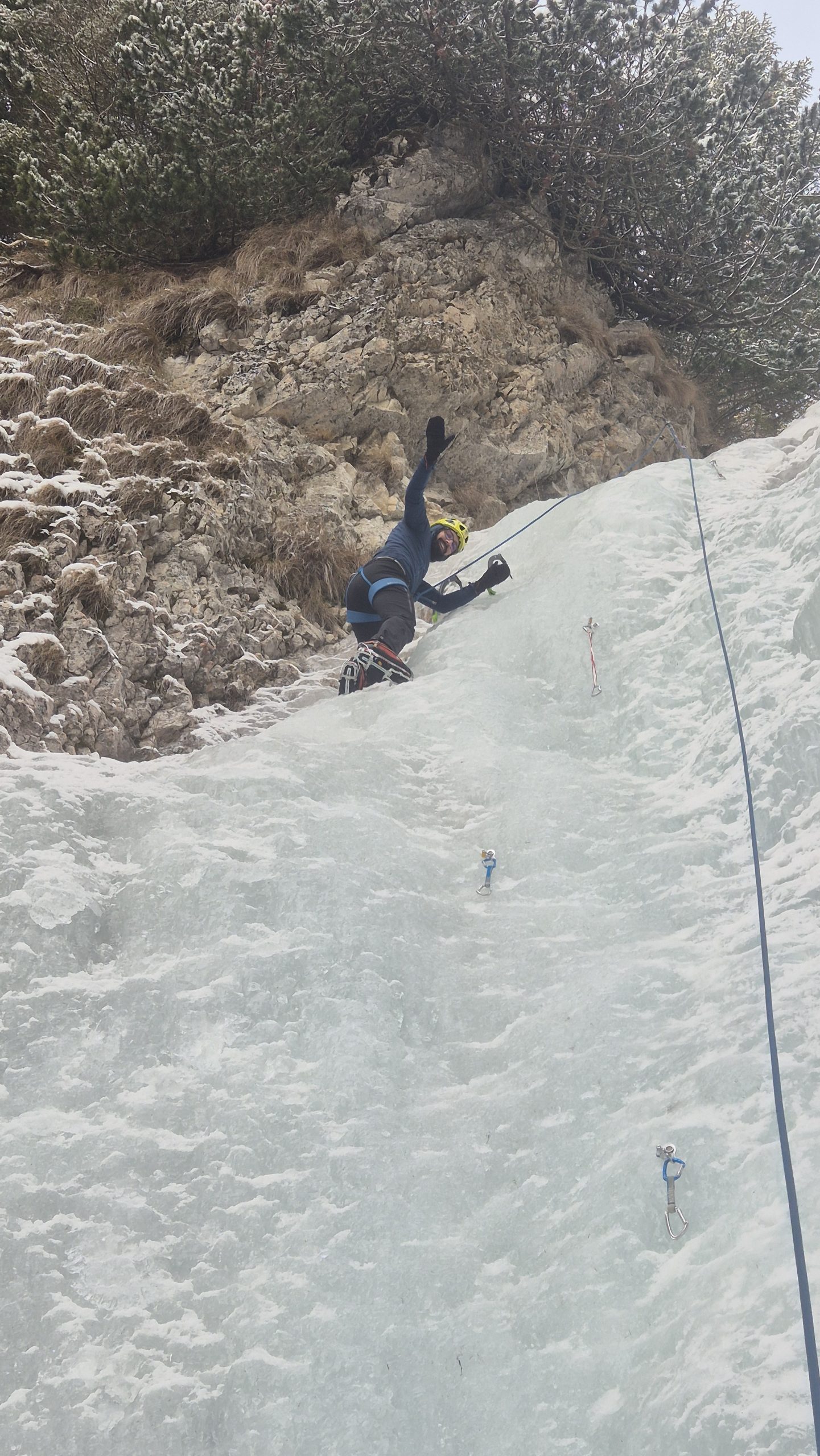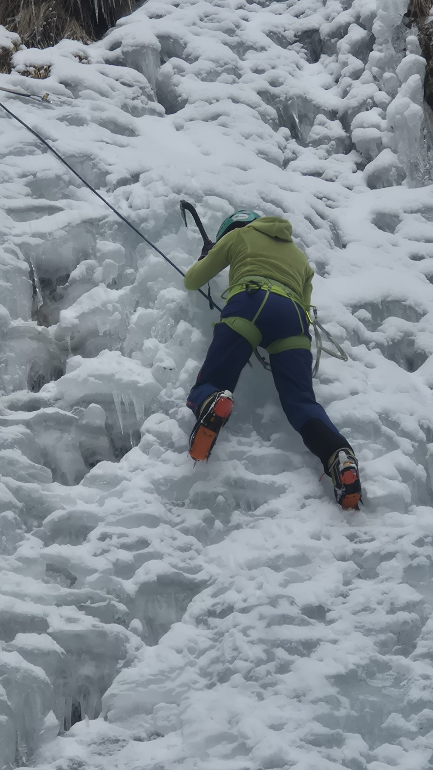 Am plecat duminica dimineata din Bucuresti catre Simon unde am lasat masina la bariera; am facut 45 minute pana la monumentul soldatilor iar de acolo inca 2 ore pana la Cascada Moara Dracului. Gheata a fost solida pe partea stanga a cascadei pe unde am si amplasat asigurari. Din cele 2 inele de rapel am montat o mansa si ne-am bucurat de alte 3 linii ale cascadei care altfel ar fi fost foarte greu si periculos de asigurat. A fost pentru toti o placere si o experineta, mai ales pentru Valentin care a incercat pentru prima data acest tip de catarare.